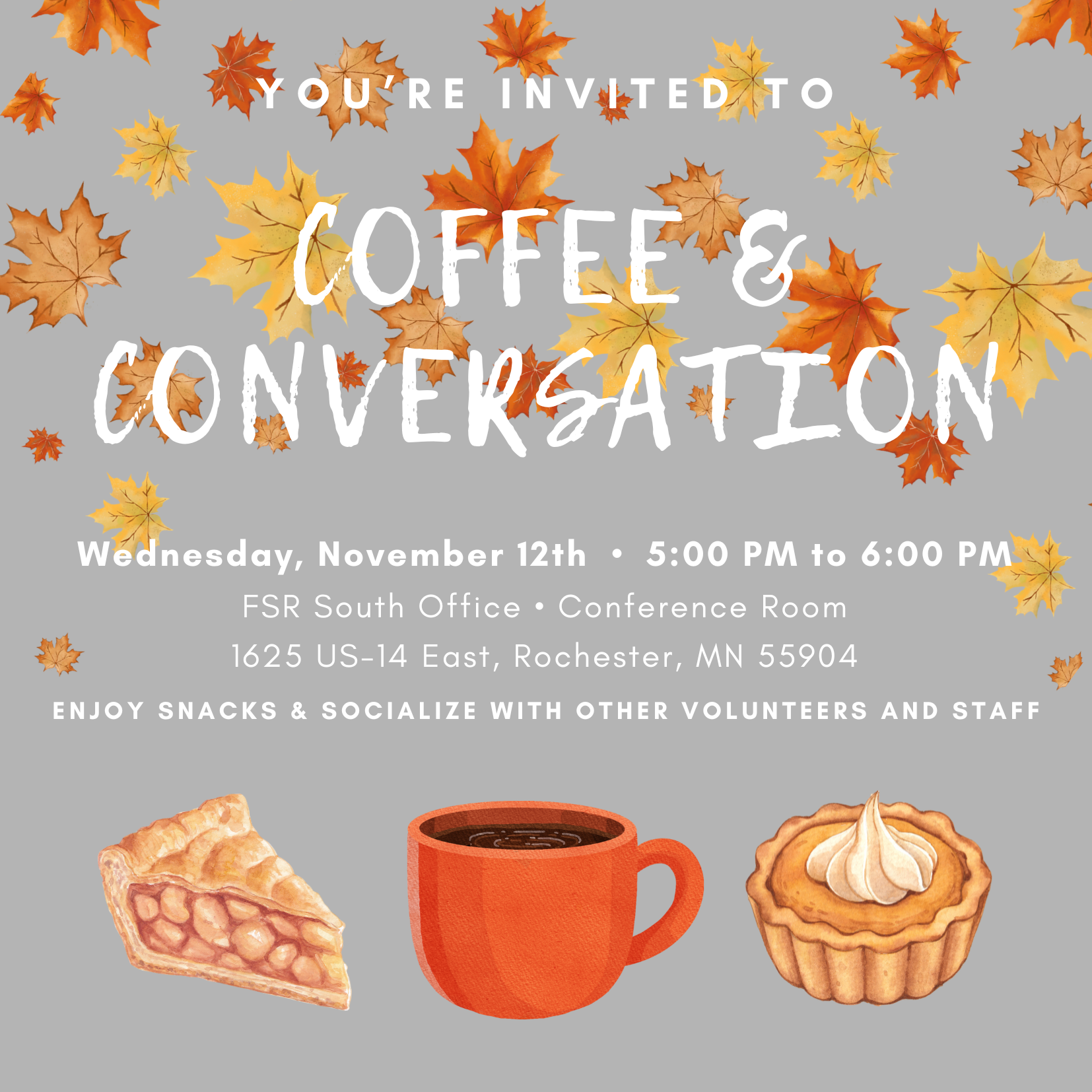 We are so very grateful for you! Come enjoy snacks, ask questions, and talk with volunteers and FSR staff. This is a fun social time to meet, network, discuss issues and concerns, share stories, and receive program updates.